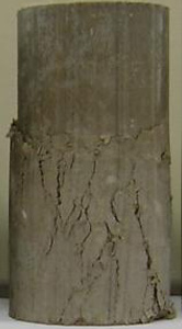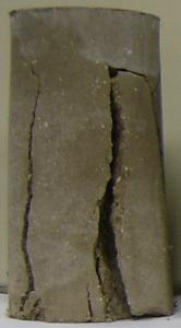 在素土中加入纖維和水泥都能起到提高強度的目的,且提高幅度基本處于同一水平(175-200%),其中素土的強度為0.16MPa,纖維土和水泥土的強度分別為0.44和0.48MPa。但素土、纖維土和水泥土的破壞特征各不相同:素土表現(xiàn)為應(yīng)變軟化的塑性破壞;水泥土表現(xiàn)為完全的脆性破壞,土體強度瞬間喪失,形成的破壞裂隙寬大,相互貫通(圖2(a));纖維土則表現(xiàn)為應(yīng)變硬化的塑性破壞,破壞后土樣中發(fā)育的裂隙相對比較細(xì)小,呈現(xiàn)裂而不斷的特征(圖2(b)),這對工程結(jié)構(gòu)的穩(wěn)定性有重要意義。此外,當(dāng)在纖維土中再加入水泥后,強度得到成倍增加,達(dá)到1.18MPa,遠(yuǎn)遠(yuǎn)超過單純的纖維土和水泥土強度之和,說明二者配合使用增強效果更佳,能極大減少材料用量,節(jié)約工程成本。