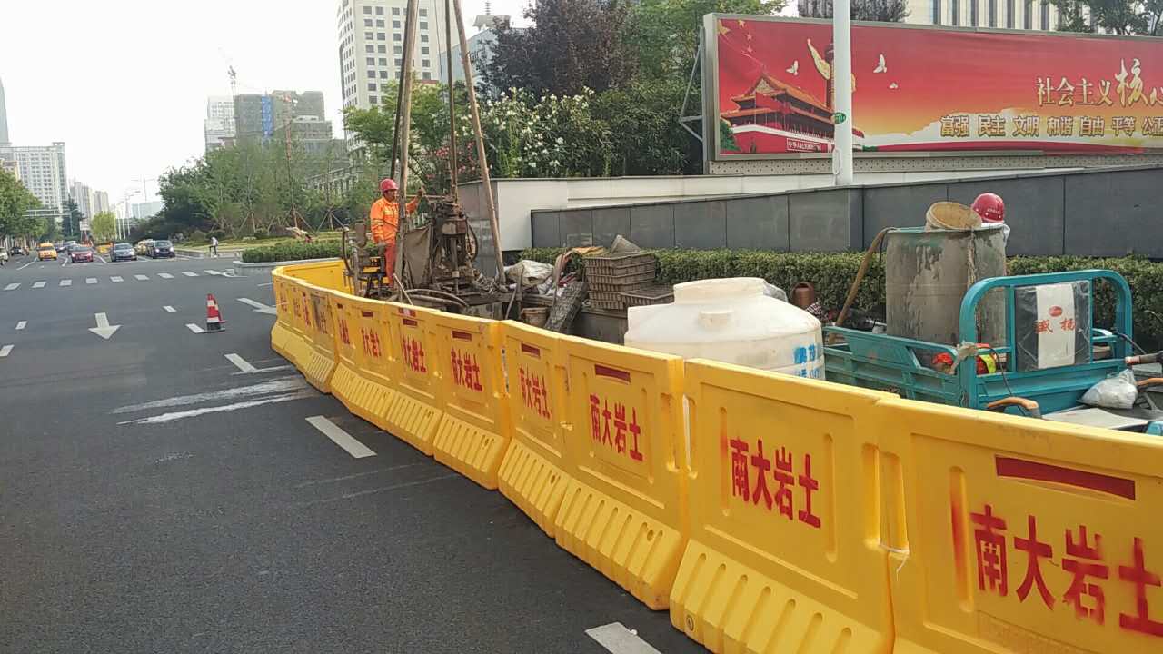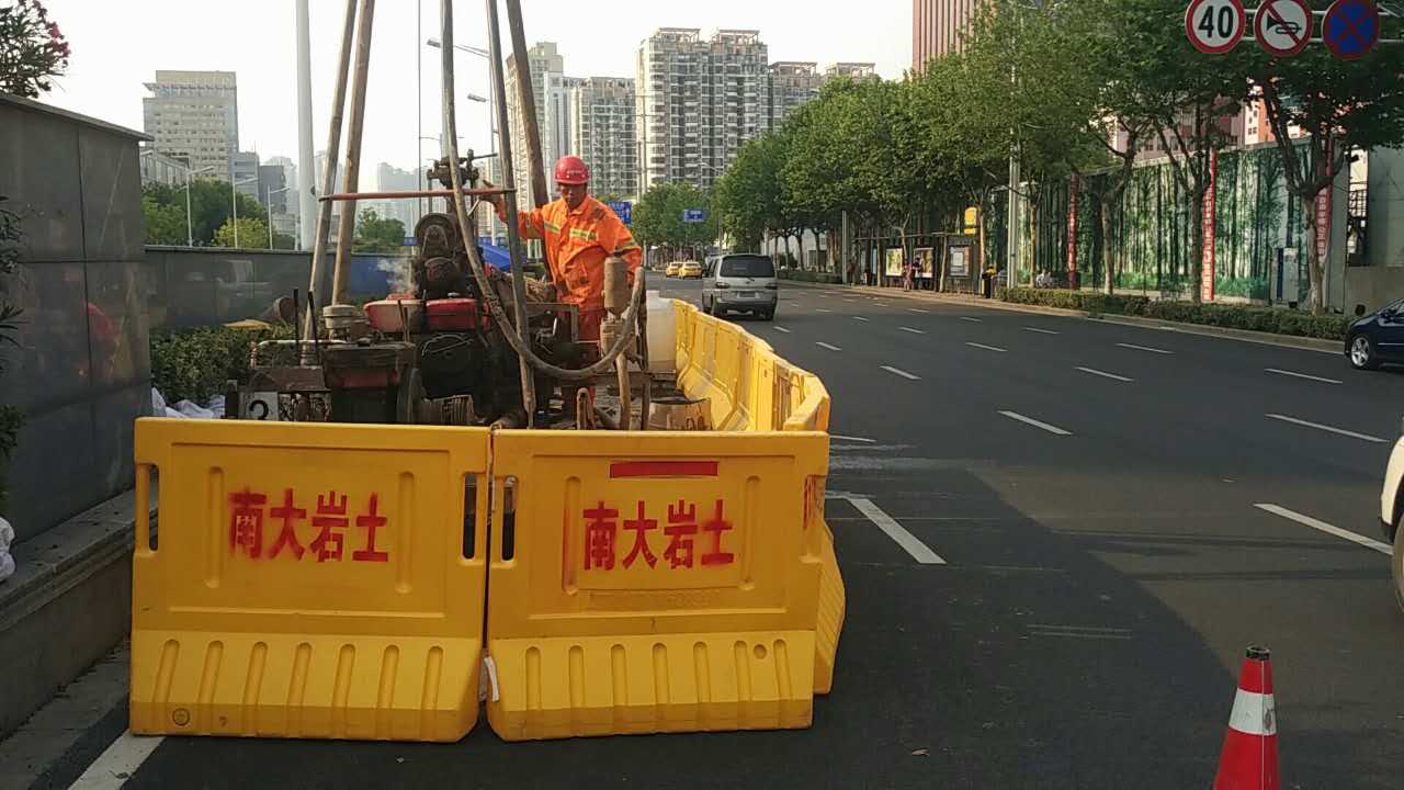 2017年5月中旬,隨著身著南大巖土字樣工作服的技術(shù)及施工人員在漢中門(mén)大街與江東路交叉口進(jìn)行施工圍擋,標(biāo)志著南京地鐵九號(hào)線(xiàn)D9-XK02標(biāo)地質(zhì)勘察初勘施工正式啟動(dòng)。本標(biāo)段南起漢中門(mén)大街,沿江東路向北至定淮門(mén)大街止,分為三站三區(qū)間,全長(zhǎng)約2.8km,初勘計(jì)劃工期2個(gè)月。